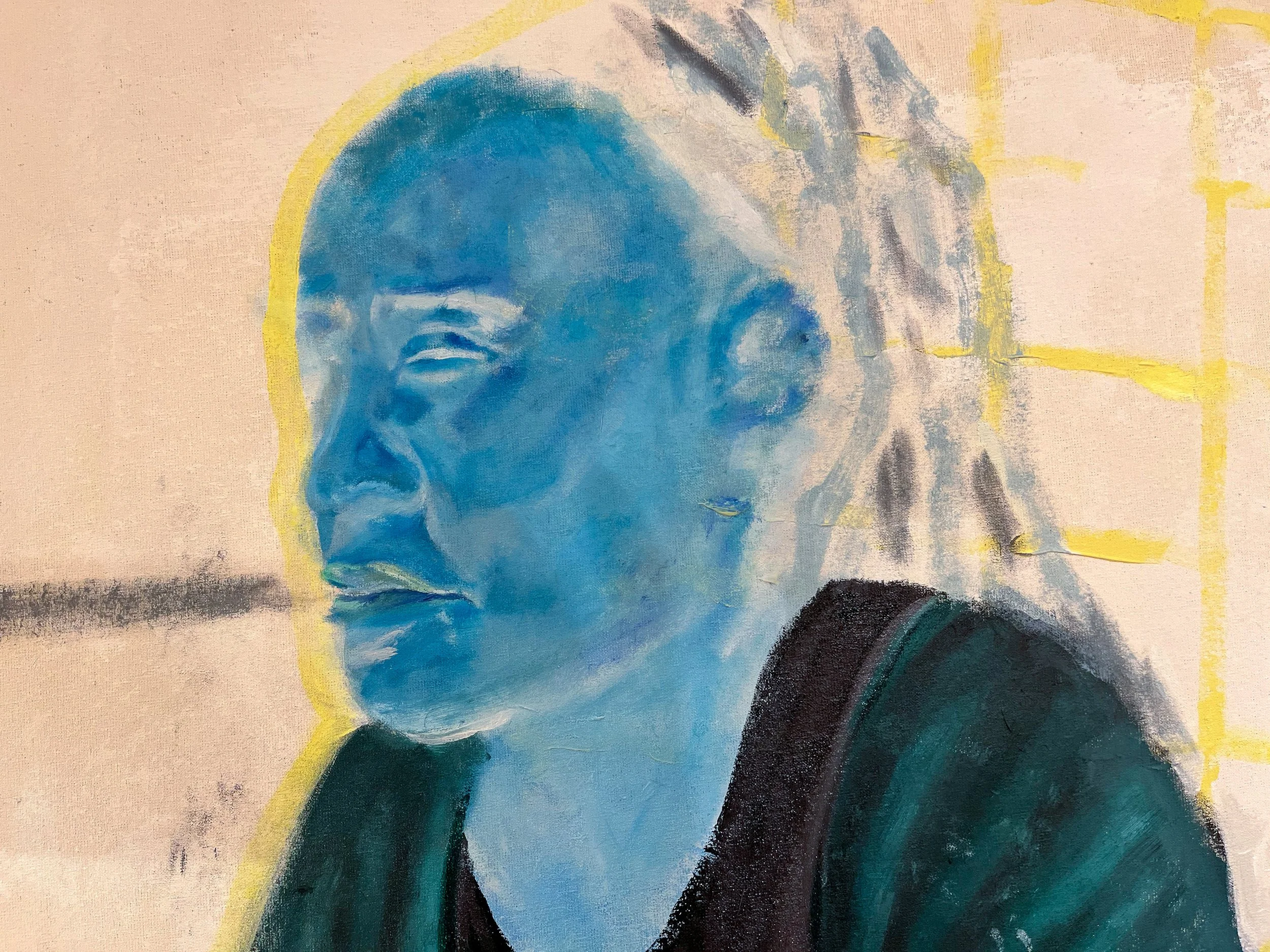 To amplify the visual impact, I employed high and vibrant colors, juxtaposed with inversion techniques on the faces. The inversion, when viewed through a smartphone, transforms the colors from a soothing pale blue to a striking reddish-brown, offering viewers a dual perspective on the painting.